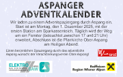 Wir laden zu einem Adventspaziergang durch Aspang ein. Start ist am Montag, den 1. Dezember 2025, mit der ersten Station am Sparkassenteich. Täglich wird der Weg um ein Fenster (beleuchtet zwischen 17 und 21 Uhr) erweitert, Abschluss ist die Pfarrkirche Ober-Aspang am Heiligen Abend.